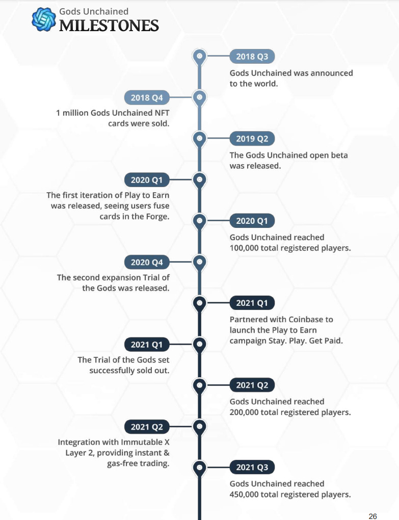 Gods Unchained is an Ethereum-based play-to-earn, collectible, fantasy trading card game. It's free to play, simple to learn, and offers play to earn opportunities right away. Two players compete in an arena to see who is the most powerful in God's Unchained. Players can choose between Nature, Light, Deception, Death, War, or Magic as domains their gods are based on. The game launched fully in the 1st Quarter of 2020, and the game has continued to evolve since reaching more than 450,000 active users in the third quarter of 2021 with more than $52m worth of cards traded in-game.