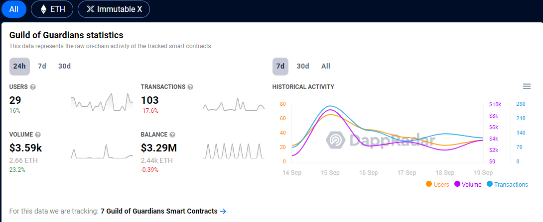 As of September 2022, the game had 29 active users who made 103 transactions, with a total incoming volume of $3,590.