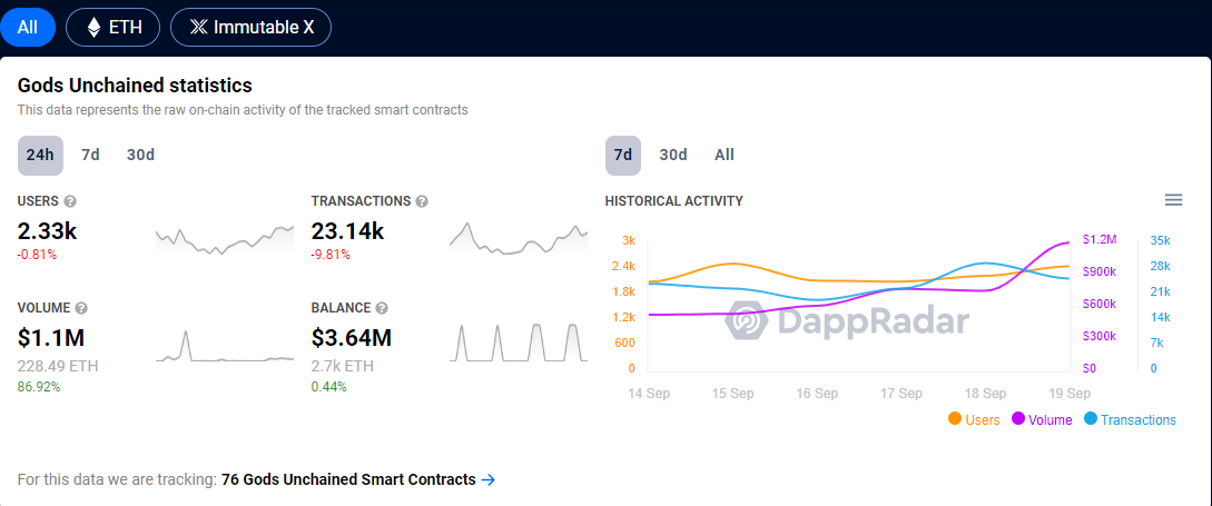 In the last 24 hours, God unchained recorded 2,330 active users, who performed 23,140 transactions with a total incoming volume of $1.1m.